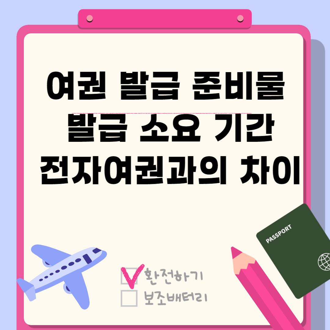 여권 발급을 위해 필요한 준비물은 신분증, 여권용 사진, 여권 신청서, 여권 발급 수수료, 기존 여권, 기타 서류입니다. 여권 신청서와 사진은 외교부 여권안내 홈페이지에서 다운로드 및 규격 확인이 가능합니다. 여권 발급 수수료는 여권 종류에 따라 다르며, 기존 여권은 재발급 시 필요합니다. 분실이나 훼손된 여권의 경우 추가 서류가 필요할 수 있습니다.